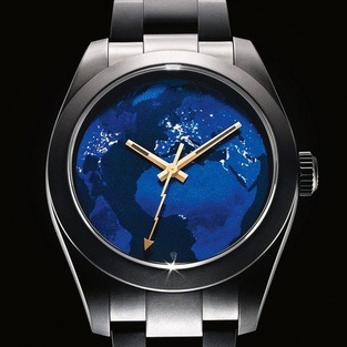 A Conde Nast luxury watch featuring a dark blue world-map dial with gold hands and a thunderbolt second hand, evoking nighttime global energy.