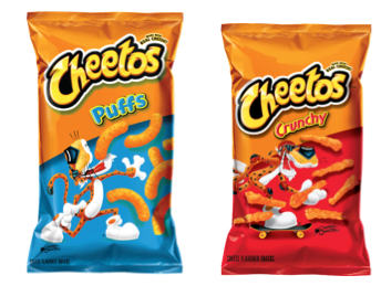 Cheetos snack bags (Puffs and Crunchy varieties) with signature orange packaging and Chester Cheetah mascot.
