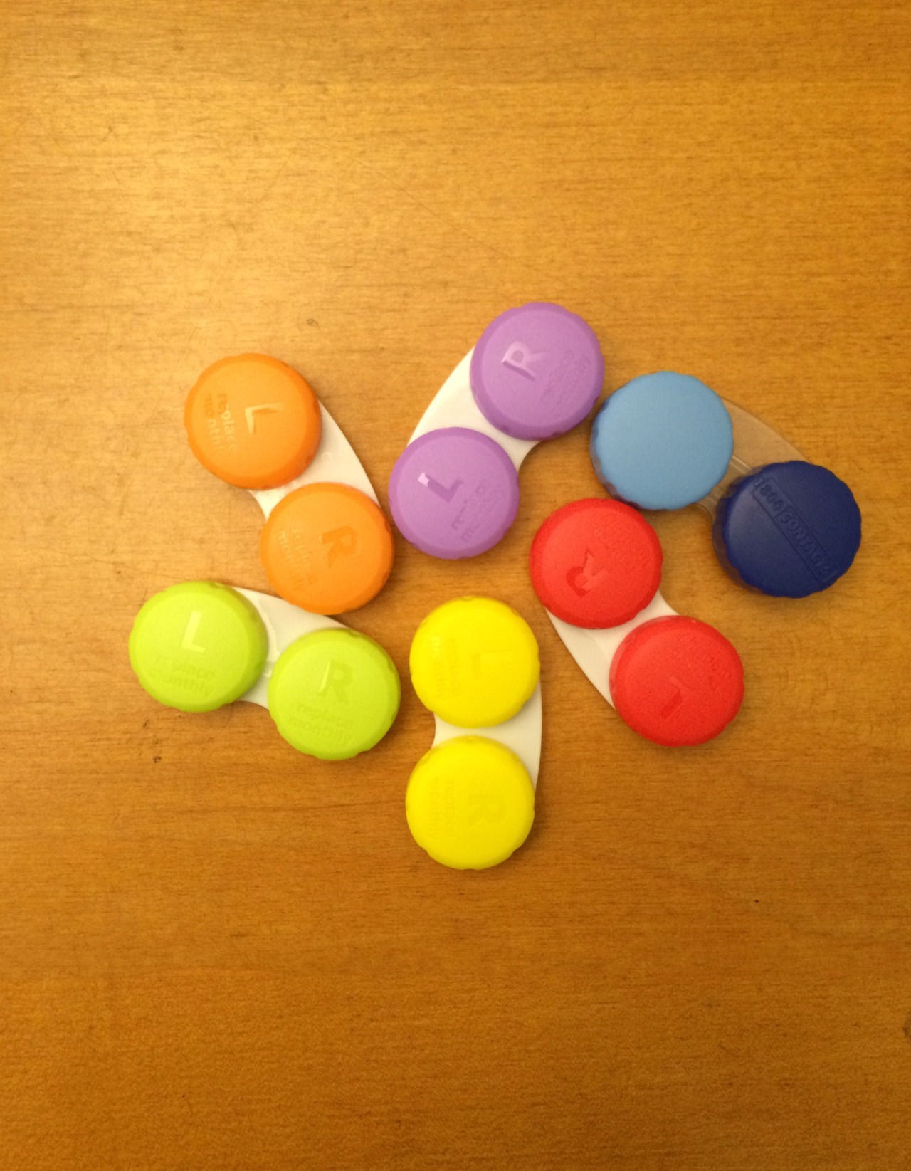 The neon colors of these contact lens cases evoke emotions of joy, excitement, and possibility. The brightness of the cases are associated with sweet candies of childhood. I could imagine each of the cases as Skittles almost, each representing something sweet and delightful. Just looking at the rainbow array of these cases makes me smile.
