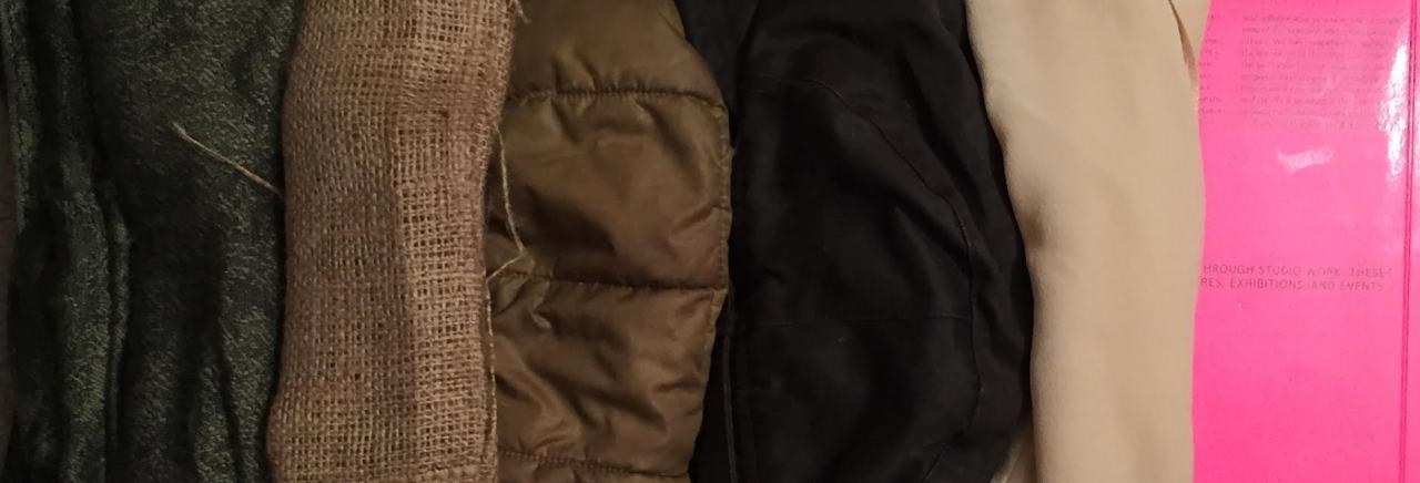 A fabric still life arranging natural neutral textiles alongside a contradictory neon pink synthetic material, exploring tension between nature and the manmade.