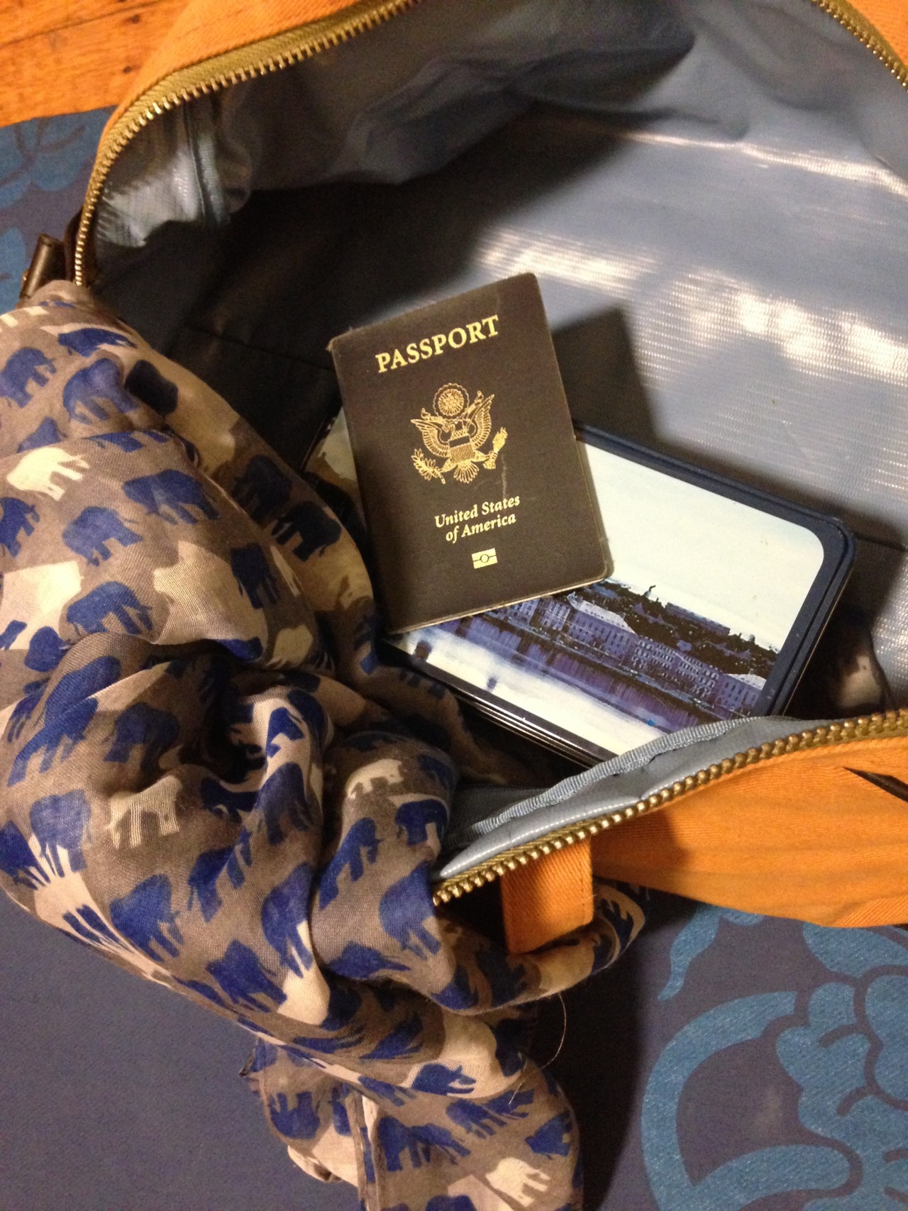 I find myself very drawn to blues in the winter. The color represents a soothing force when life seems to dull or hectic. I worked with this idea to create a collage of travel, but really more a daydream about escape. I pulled on items that connected me to a foreign place, and would provide a quick relief from my present surroundings. For an actual trip, this would be a sorely inadequate bag but the colors provide the quick fantasy, which is why I think I keep myself draped in blue all season.