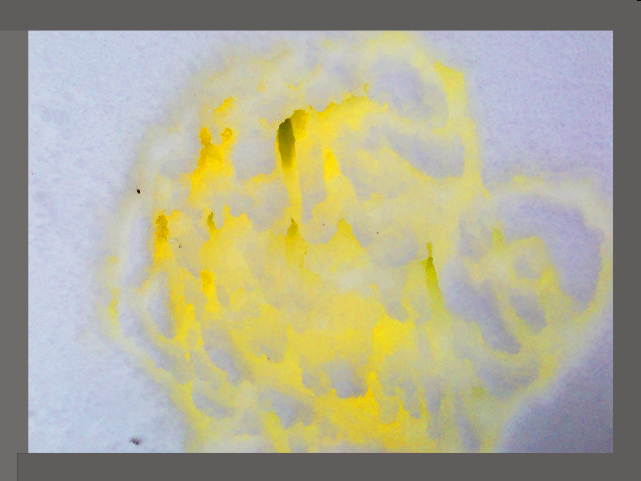 A photograph taken during a blizzard walk, inspired by Maira Kalman, showing an abstract yellow form in white snow — exploring the brain's ability to construct stories from minimal visual information.