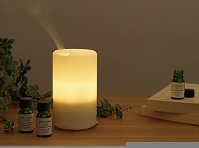 Muji aroma diffuser — a minimalist cylindrical white device that emits mist and warm light, shown with essential oils on a wooden surface.
