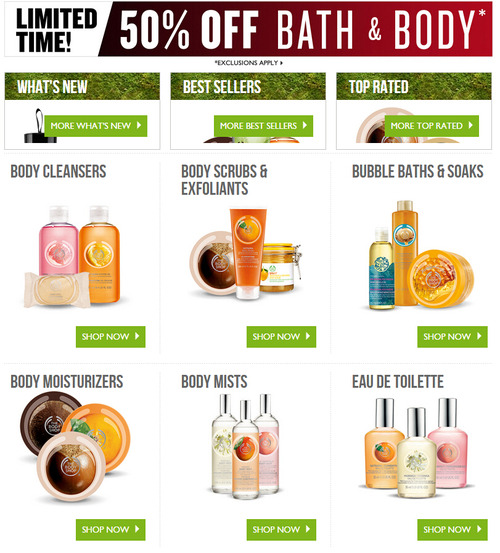 The Body Shop bath and body products — a colorful range of cleansers, scrubs, moisturizers, and fragrances offered with membership discounts.