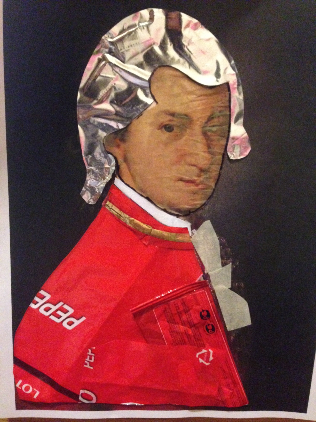 A collage portrait of Mozart made from recycled materials (foil wig, red product packaging for the iconic coat), exploring the cultural fascination with his image.