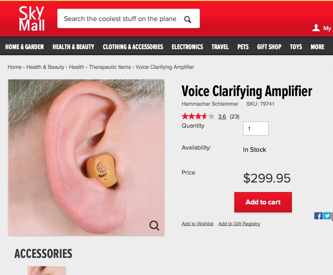Redesigned SkyMall hearing aid available in 20 bold colors, targeting baby boomers — reframed as fashion statement rather than embarrassment.