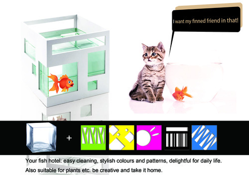 1. Colour(eye): more choice are provided to satisfy customers’ difference; 2. Pattern: Instead of the traditional hotel facade, customers can get a variety of pattern to create various windows for their fishes; 3. DIY(hand): I try to sell the concept that customers will be able to assemble the fish bowl by themselves. 4.(mind, nose) Function: Not only fishes, plants, flowers even pens can stay in the bowl. 5.(ear) The cat helps to persuade customers with words.