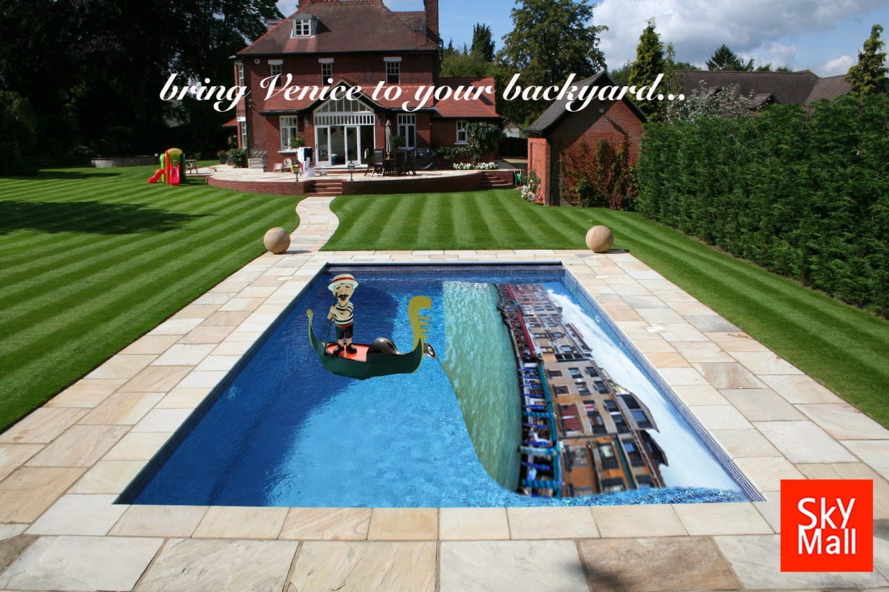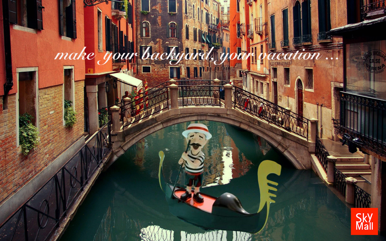 Much of the problem I diagnosed with SkyMall was not only its inability to engage the senses of its consumers, but also its inability to have its products tell a story that captivates them. This part is important, because the only way you can appeal to your consumers is by having the products themselves tell a story or create a mindset that the consumers want for themselves. Hence, when I chose to work with SkyMall’s floating gondollier (shown here: http://www.skymall.com/singing-gondolier/417953.html#cgid=10530&start=1), I decided to flip this unimaginative storyline that the original SkyMall photo was telling and make this edited image. This product now transports consumers to the streets of Venice, Italy, a global tourist destination (insert video:https://www.youtube.com/watch?v=TCrsWf2x5cA), using its image projection capabilities that projects over the pool itself. This is the heart of what this product represents and what the consumer is actually interested in. By framing the product as a way to get closer to this romantic destination, I think users will be more enthralled to purchase this product. I further believe that tying in the vacation component is relevant to the SkyMall consumer, as they notably are travelers skimming the magazine on their way to a destination or on their way back. They are either eager to spend out of excitement or want some vicarious form to make the joys and pleasures of vacationing extend. This product can provide that for them.