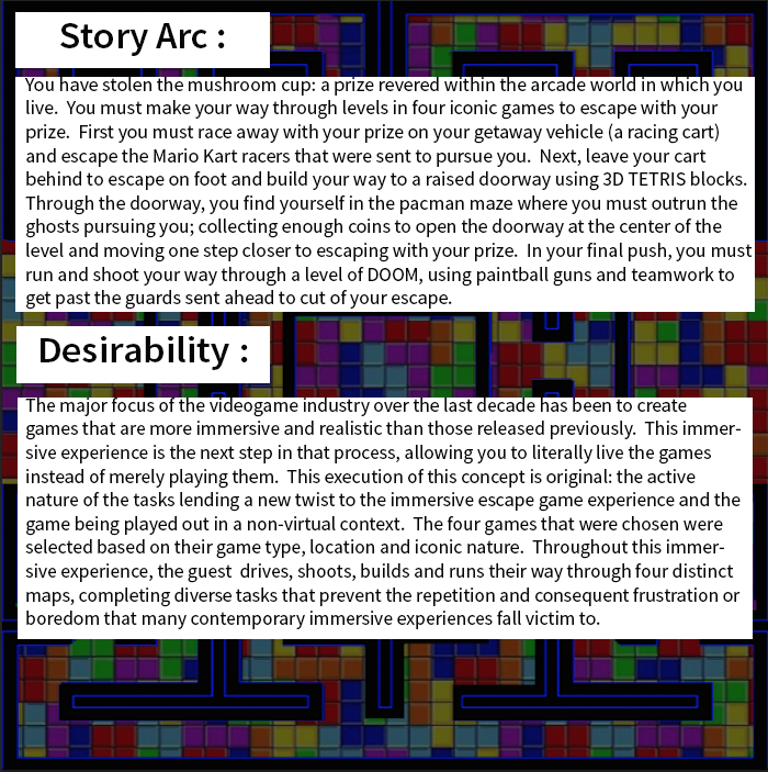 The last photo is a concept for how the Tetris part of the game could function – effectively building a staircase to access a raised doorway.