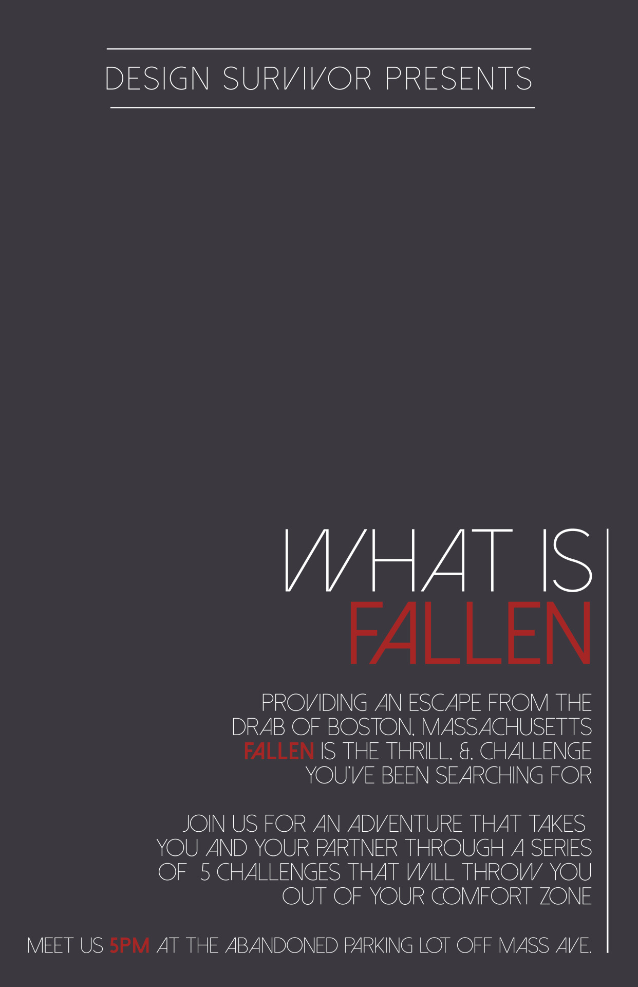 Most people have daily patterns and rituals. They get up in the morning and go to school or college or work. They eat breakfast, lunch, and dinner. Sometimes they go to concerts or events with friends. But there’s a part of people that wants more. A part that wants excitement and thrill. A part that wants to be heroic or bold. Fallen caters to this desire for thrill and flings people into a high stakes, scary scenario where the only goal is to get out. But we didn’t want to focus on having to figure out an evil plot; so, the focus of the game is on surviving. There’s only one path out to be a daredevil hero, and the players must do all they can to get out and be the ultimate survivors.