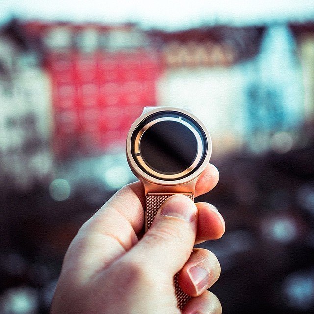 Ziiiro 'eclipse' watch — minimalist timepiece with dark circle ringed with gold alluding to solar eclipse. Focus on simplicity and rarity.