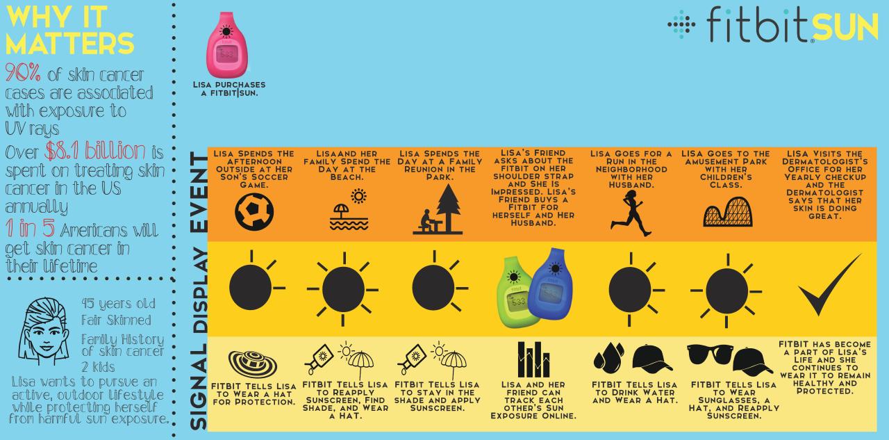 Sample User Journey: Lisa is a fair-skinned woman with two kids who has a family history of skin cancer. She buys Fitbit Sun to better help her monitor her sun exposure. As she does different activities, she receives feedback about how much sun she is being exposed to during different activities that she participates in and receives suggestions and reminders about what sun protection she should be using. The Fitbit Sun becomes a part of her lifestyle and daily routine and when she goes to her dermatologist, he gives her a clean bill of health and tells her that she is on the road to maintaining healthy skin.