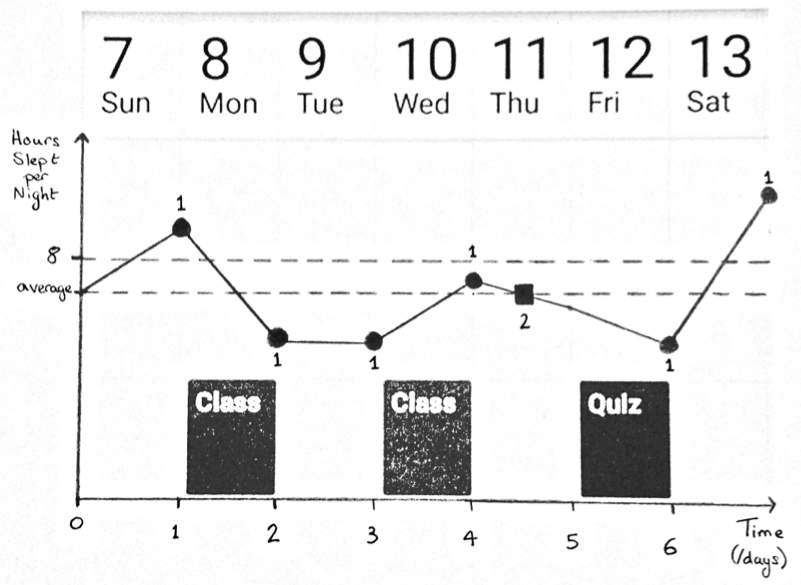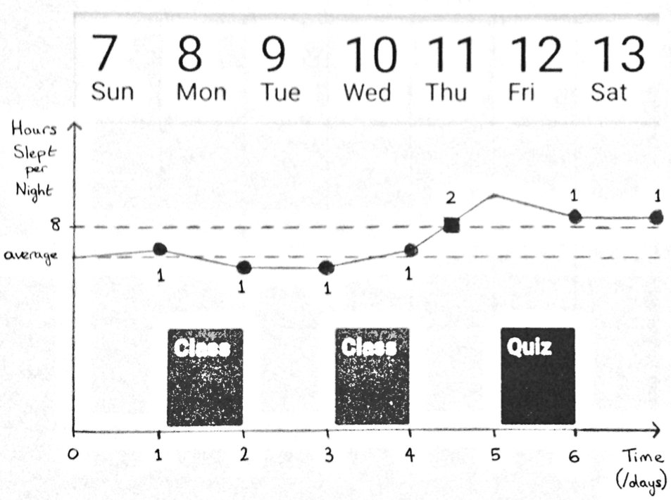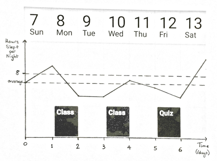 follow the user, Bill, through a week involving 2 days of class and a quiz. Graph 1 shows how Bill would have slept during the week without the