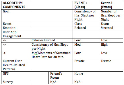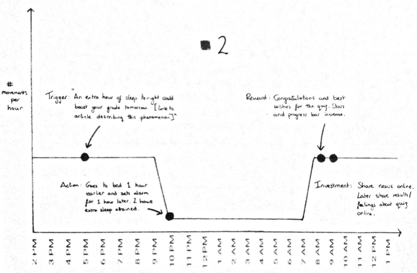 tone of the messages sent to Bill. He is relaxed about class but becomes more stressed as the quiz draws nearer. This affects the amount of sleep that he would ordinarily get – sacrificing sleep for more study time. The Fitbit encourages him to sleep more consistently throughout the week, using guilt as a motivator when he is more relaxed and the GPS places him away from home, late at night. As the test draws nearer and Bill gets more stressed, the tone of the messages changes from guilt inducing to encouraging and factual, suggesting to Bill that he focus on sleeping more and sending him links to articles that illustrate the positive effects that sleep has on academic performance.