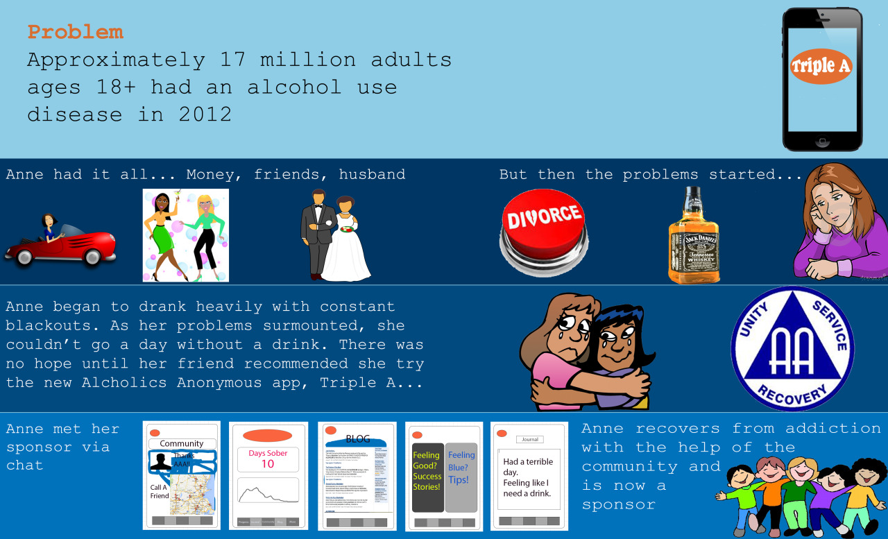 Triple A is an iPhone app that is meant to enhance the Alcoholics Anonymous Experience/Network. Alcoholism is a problem that affects many throughout the world. AA is an organization that has been proven to help people, but so far is mainly just in person. We decided to make the experience of AA mobile, and so we created an iPhone/Android app that would allow people who had never tried AA before to get a feel for AA and get help completely free and anonymously if they so desire.