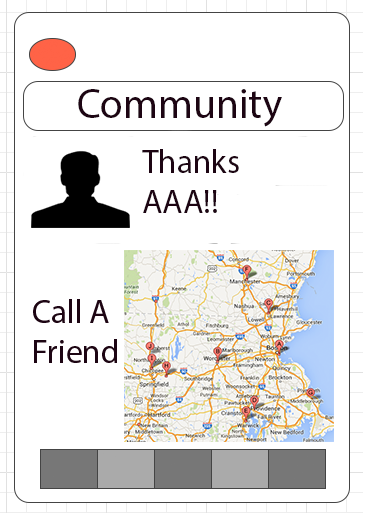 3. Community: This is the best part. Community really works for AA’s mission, so we’ll have a section where Anne can see other user journals and scroll through and respond to comments. And the best best part is a geolocation app that shows Anne where on-call volunteers for AA are. If Anne is feeling really terrible, she can anonymously broadcast a message which the on-call volunteers will all see and anyone can respond to her (they will respond within 30 minutes). She can message them through the map, talk with them over phone, or meet them in person if she wants to.