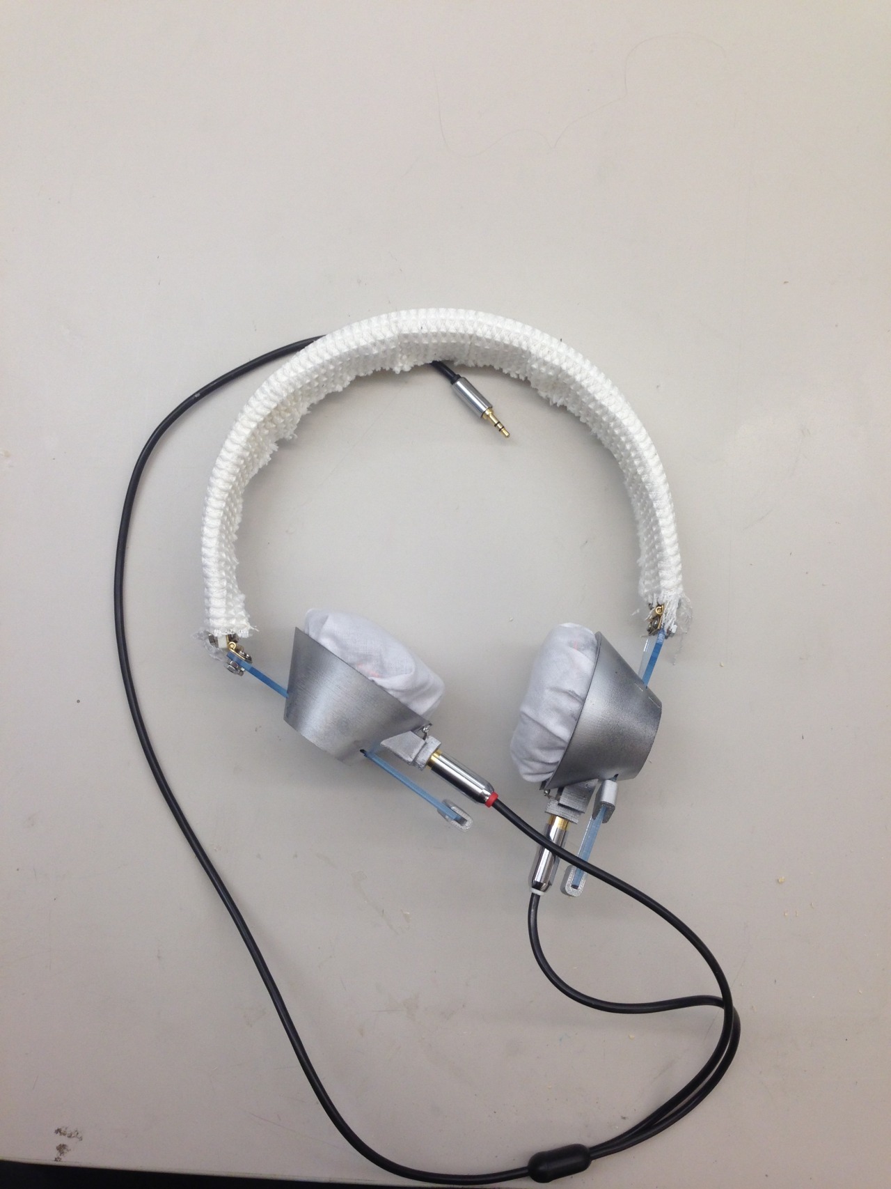 We created headphones people will use when listening to a song that conveys a positive emotion. We took the original headphones file and edited it in the following ways. First, we wanted to get rid of the oval-shaped earpiece and replace is with a circular earpiece. This was easier on the eyes and more symmetrical. We then changed the band to be thicker, stronger, and more aesthetically appealing. For functionality we essentially cut the band in parts in order to incorporate hinges into the headphones. We wanted a sleek appearance so we decided to laser cut part of the band. We also created little clips that will allow for adjustment of the earpierce along the band. The colors used in our headphones are white, silver, red, light blue and black- all bold and generally positive-emotion-evoking colors. We also used a fabric found in a hardware store which gives off a happy, soft, gentle vibe.
