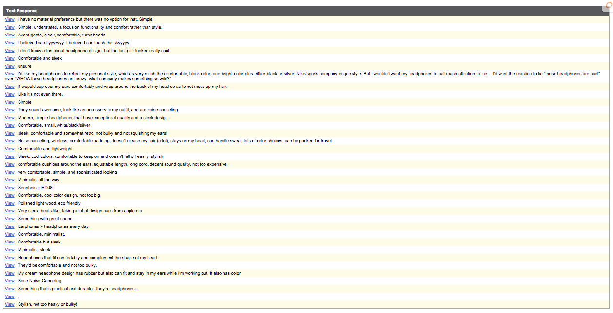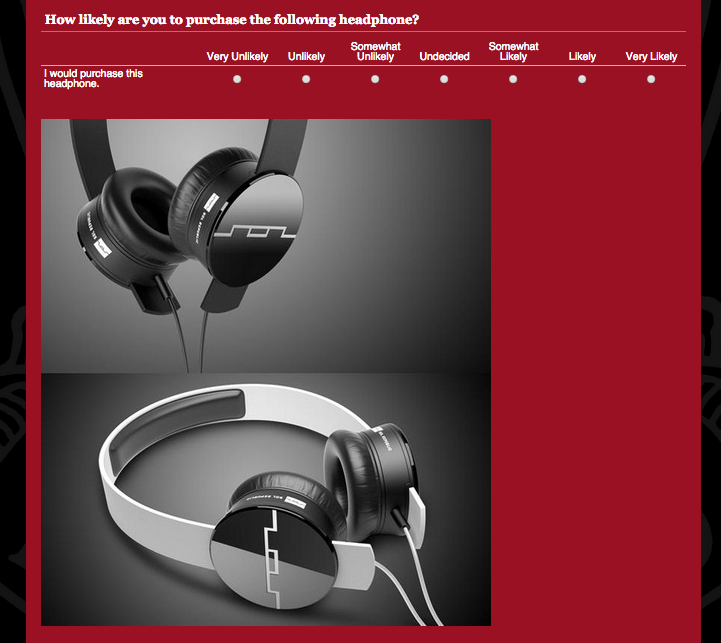 Before designing our headphones, our team wanted to solicit user feedback surrounding headphone design before proceeding. We designed a survey that asked potential users about their preferences in material, characteristics, and showed them example headphones to rate their likelihood to buy on a 7-point scale.