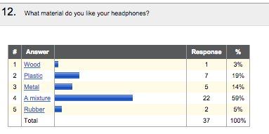 From our results, we found that people prefer a mixture of materials in their headphones, which is why our headphones are made of plastic, plush, leather, and “wood”. When rating characteristics, the majority of users wanted headphones that were comfortable, sleek, and minimalist. Our design incorporated these features by being simple and made with comfortable material.