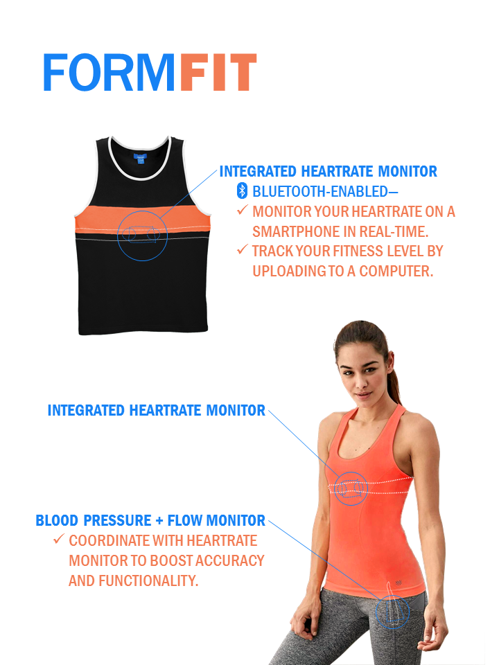 FormFit, a smart athletic tank top with integrated heart rate monitor, blood pressure and flow sensors, and Bluetooth connectivity for real-time fitness tracking on a smartphone.
