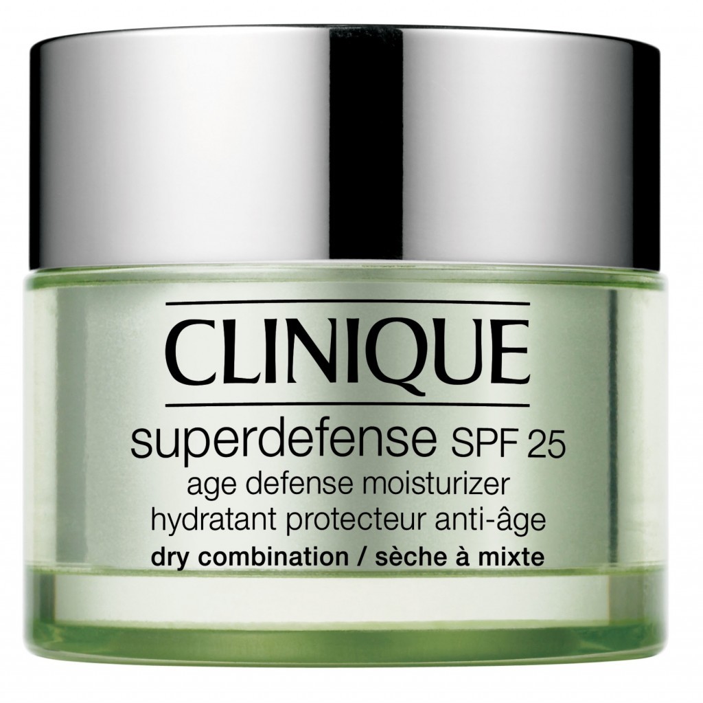 Clinique Superdefense SPF 25 age defense moisturizer, used as an example in a critical essay about how anti-aging beauty brands exploit fear of death to manufacture desire.