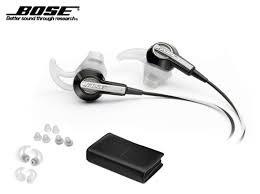 Bose in-ear headphones with ergonomic triangular ear stabilizer, soft ear tips, sleek black-and-white design, and inline volume control.
