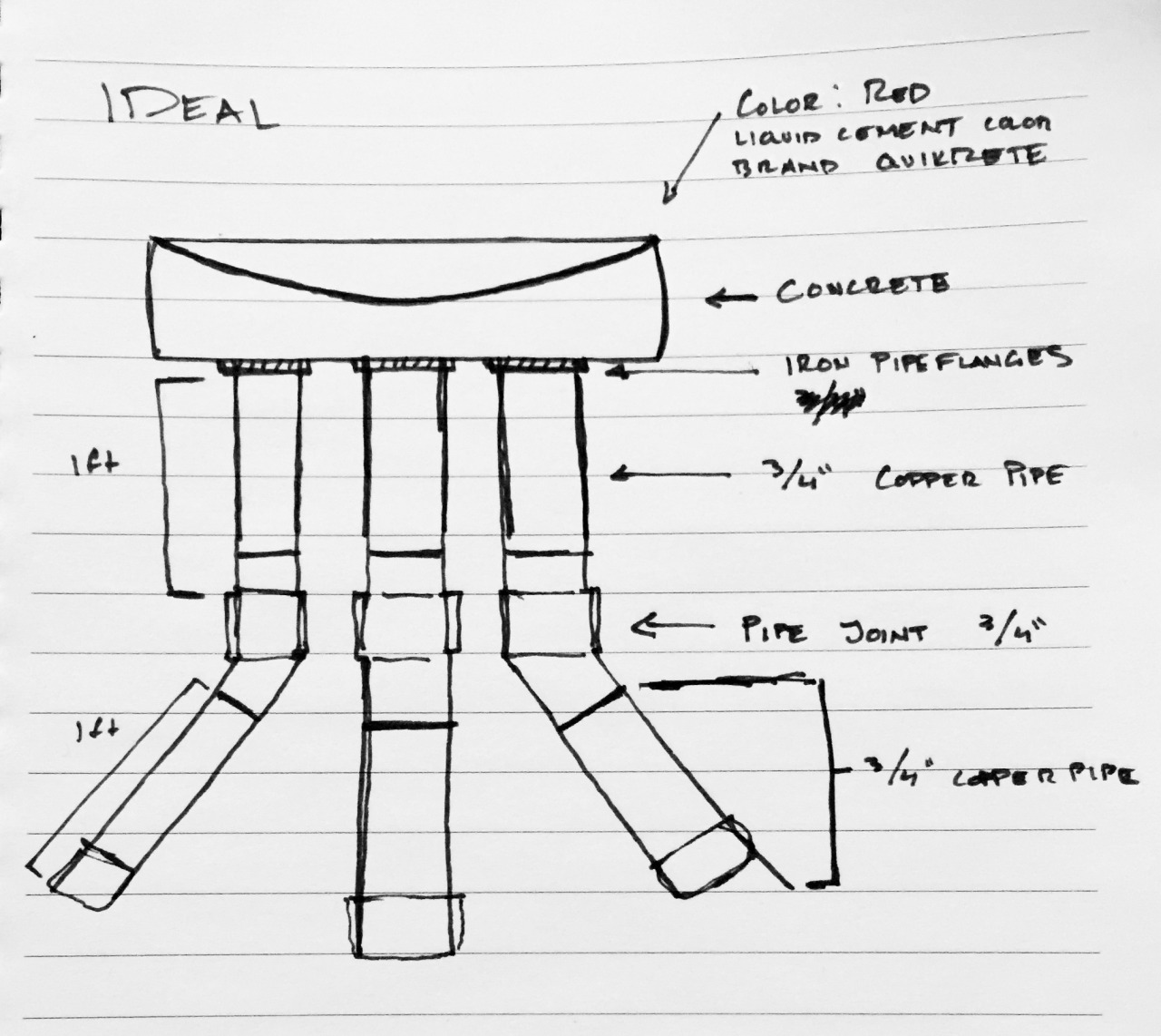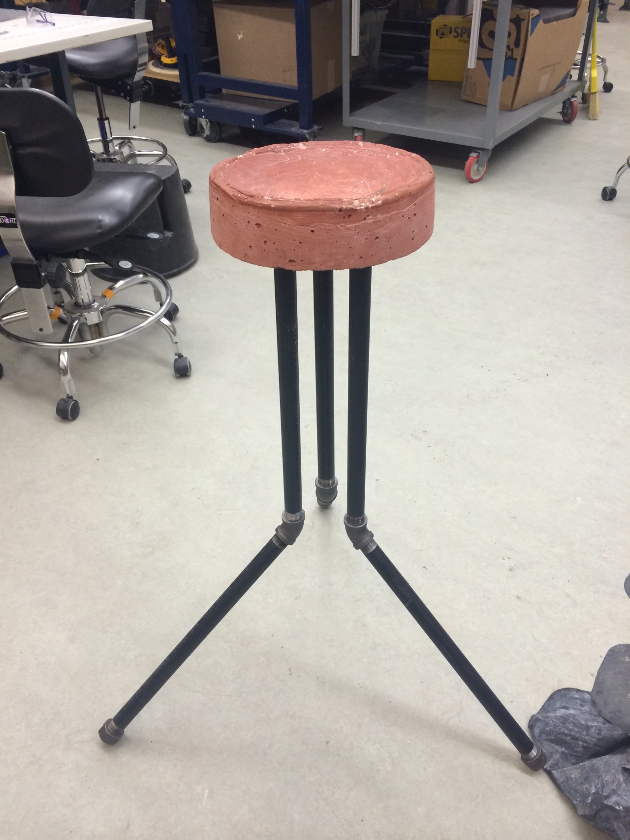 Challenge 6Piped Stool: a student-made red-pigmented cement stool with black pipe legs, 45-degree elbow joints, textured seat options (ceramic bowl indentation and postal tub ridges), created as a furniture design challenge.
