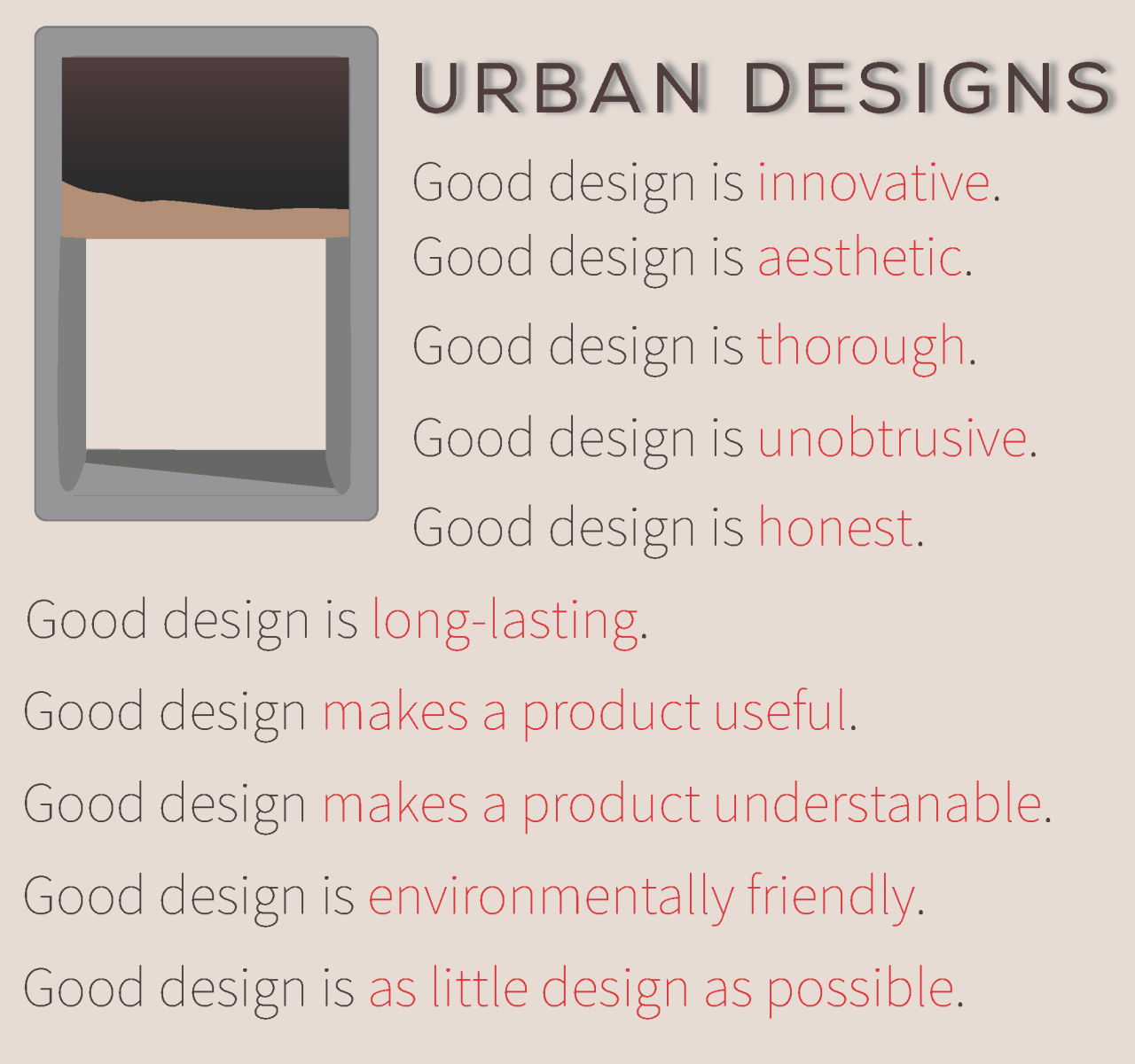 A student-designed concrete and dark wood nightstand presented as a digital graphic illustrating Dieter Rams' 10 principles of good design.