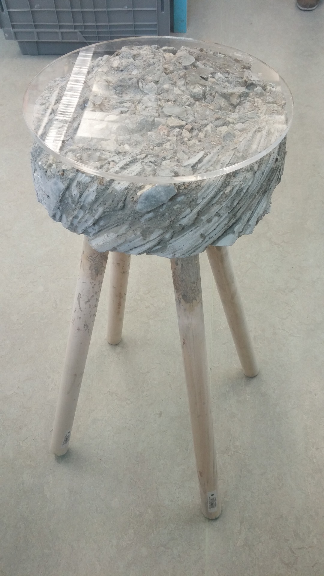 A student-designed concrete stool with embedded recycled plant cuttings creating a 'faux-fossil' aesthetic, topped with a clear plastic seat, on wooden legs.