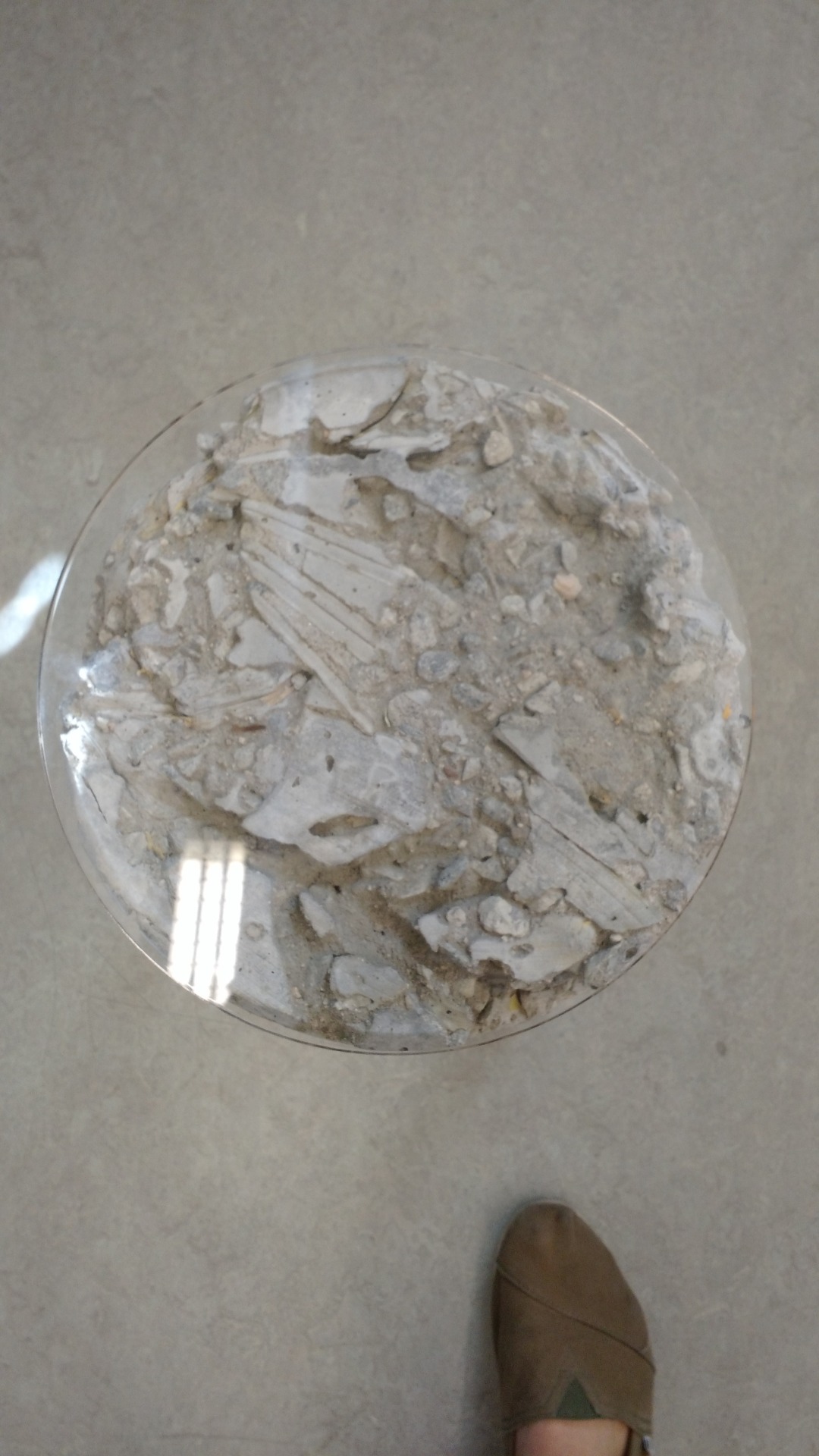 A top-down view of the same faux-fossil concrete stool, showing the clear plastic top with embedded plant material visible through it.