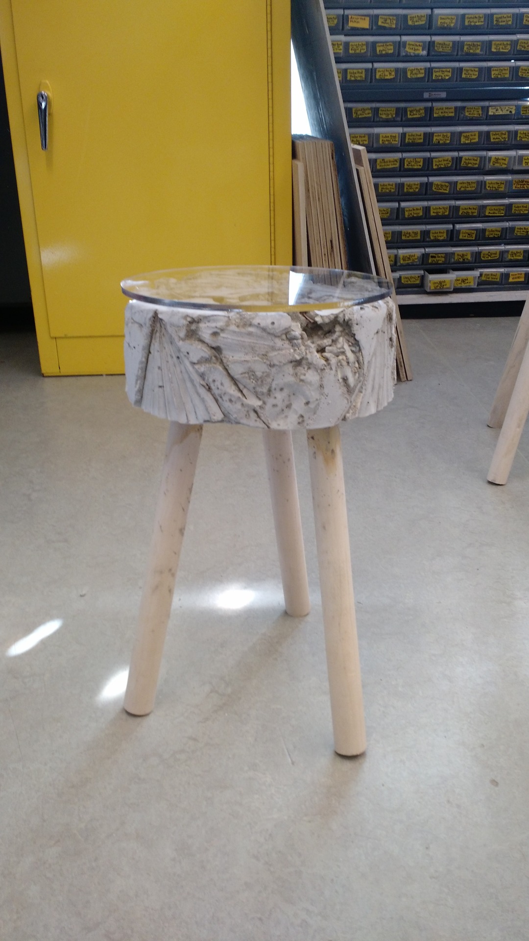 We kept the form of the stool simple added aestetic design. We did not anticipate how rought the stool would be and so added a top to make it sitable and to still see the “fossils”