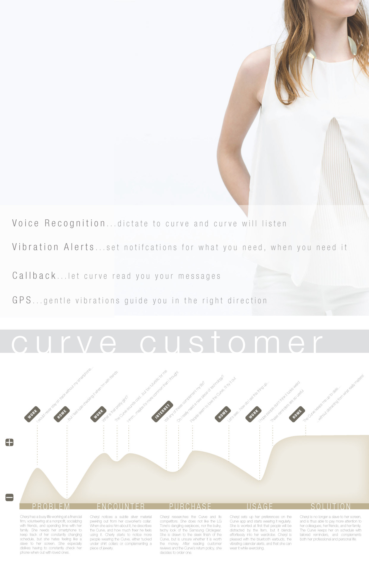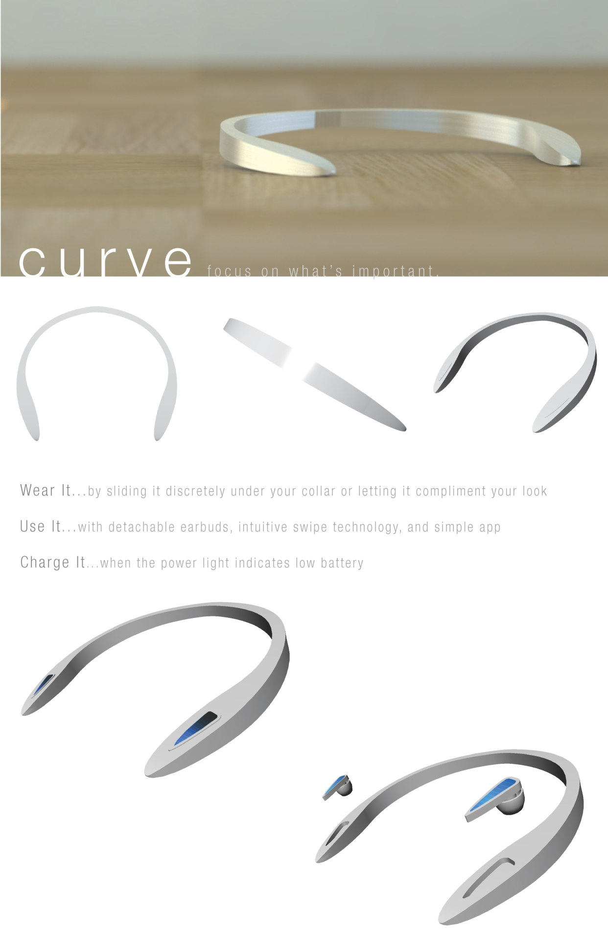 Curve, a concept wearable neck-worn communication device made from lightweight aluminum with voice recognition, GPS navigation, and detachable earpieces.