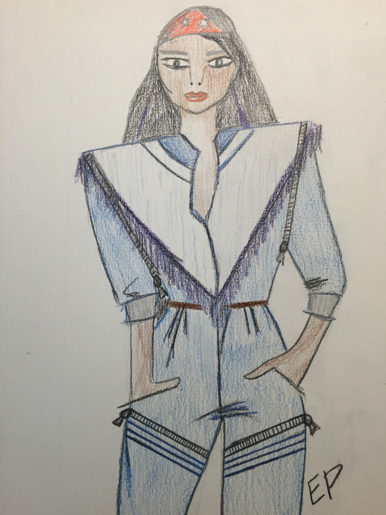 I imagine a more stylish woman wearing this piece as it harkens back to an ‘80s era with the decorative fringe and exposed zipper details. The material would be a medium-weight denim that can hold up the zippers but light enough to give the garment movement when she’s out and about.