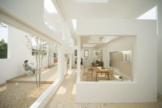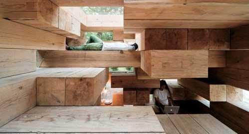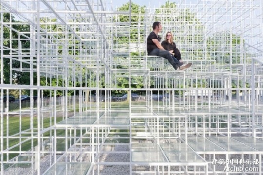 Architectural installations by Sou Fujimoto, featuring an open white grid-like pavilion structure that visitors can climb and inhabit.