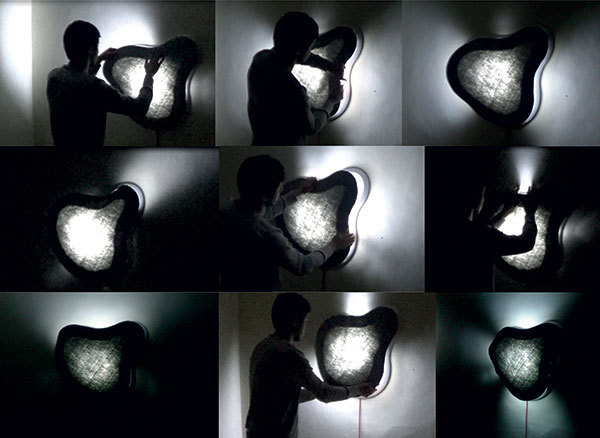 The Leaky lighting project, a cloud-shaped felt wall light inspired by crepuscular sun rays that lets users uncover sections of felt to direct concentrated beams of light indoors.