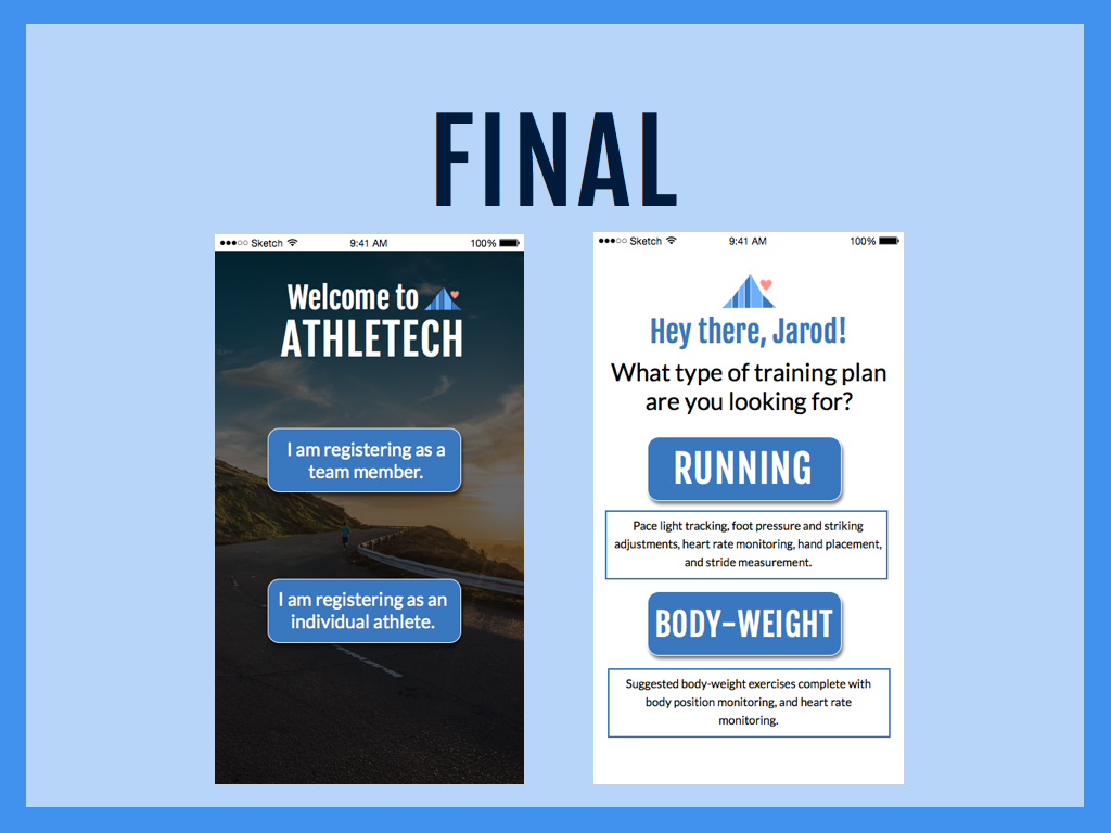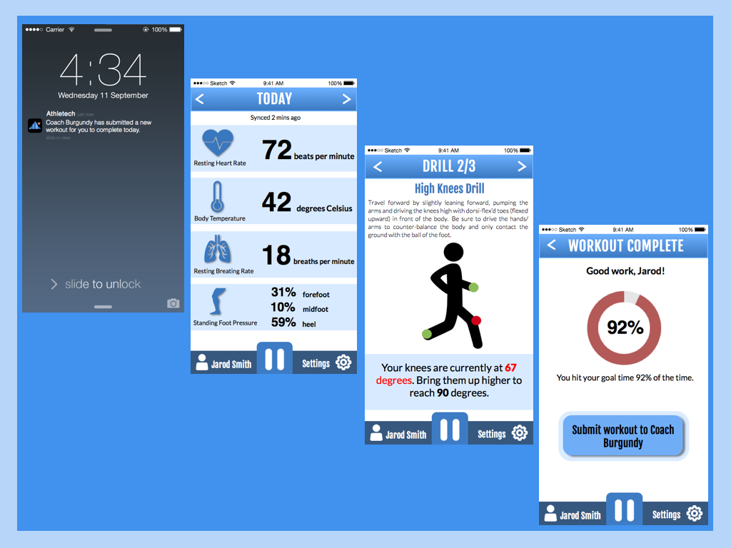 Athletech is wearable technology that connects sensors on your workout clothes to an smart phone application that gives you real-time feedback on your workout as you complete it. Athletech is both for coached athletes and athletes who want to coach themselves. Coaches of athletic teams can send workouts to the application so that the athlete can complete it with the coach’s feedback in his/her ear, and then submit the workout statistics back to the coach. For the solo-athlete, two workout plans are available — running coaching or body-weight exercise coaching. Both plans give you real-time feedback on exercises based on IMU, heart rate, and pressure sensors, so that you can become a better athlete, all without having to pay for a coach or personal trainer.