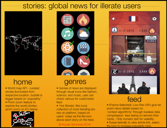 A student-designed global news platform called 'stories' for illiterate internet users, using only numeric text, map-based navigation, icon-based genre selection, and compressed lo-res GIFs instead of text articles.