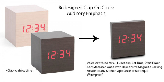 I provided the Voice Activation technology first, to communicate the ease of usage while cooking. I described the type of wood and magnetic inserts to appeal to tactile senses, while keeping the material of clean wood to resonate in customer’s minds: they can almost feel the product before they buy out of familiarity. I cut down the design down to a wood slate that gives a more modern design to an otherwise cumbersome clock, which appeals to customers eyes in the search of a contemporary kitchen consistent with new state-of-the-art home appliances. The magnets allow the clock to stick to virtually any cooking appliance, and will ‘hear’ your commands no matter what you are cutting, stirring, etc. – all you need to do is look.