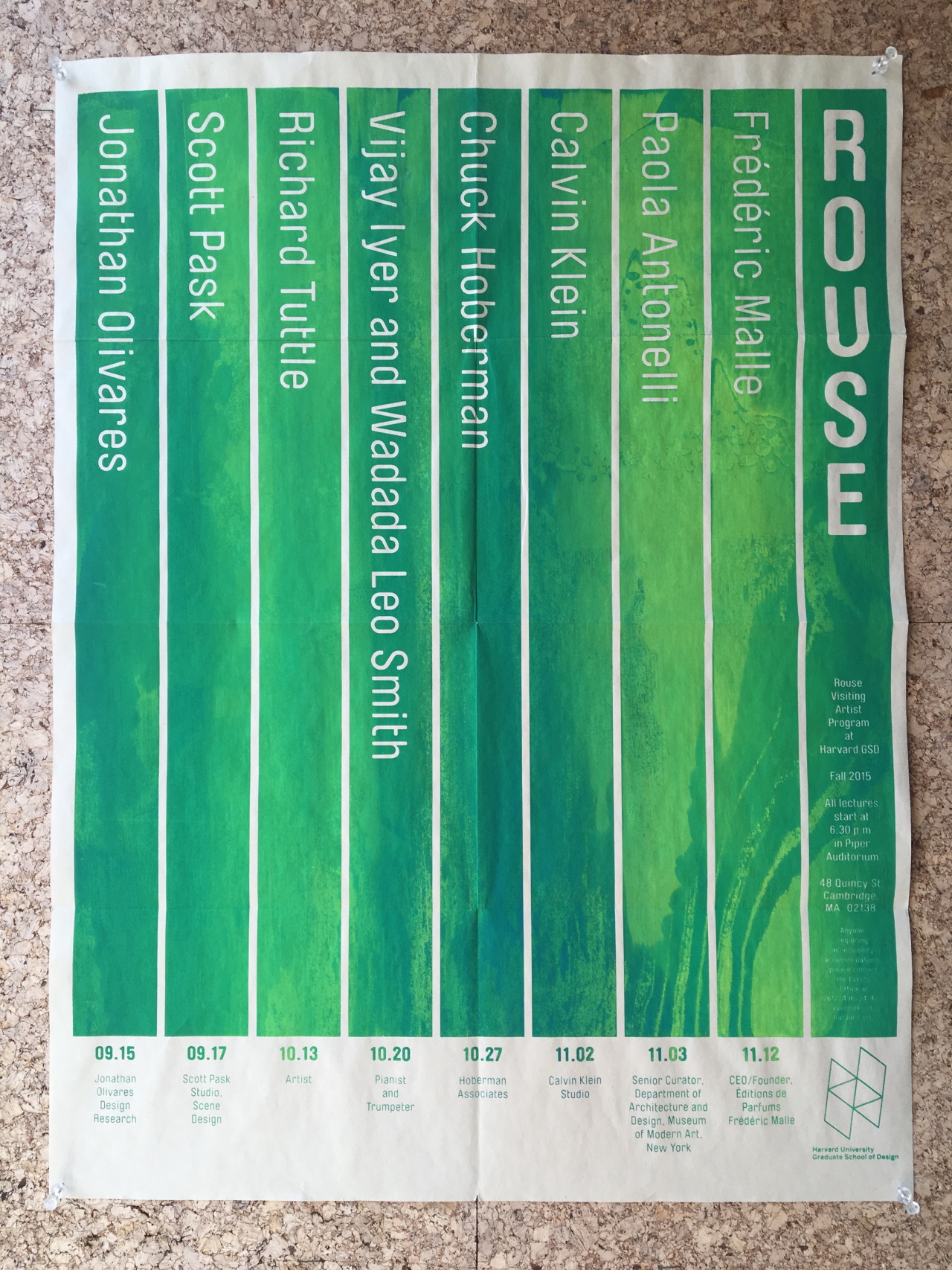 A printed poster for the Harvard GSD 'Rouse' visiting artist lecture series, featuring green paint swirls on textured brown paper that the student took from a museum bulletin board.
