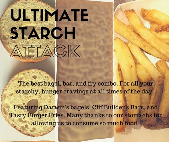 A group tasting challenge summary poster showing 'Ultimate Starch Attack' — comparing Darwin's bagels, Clif Builder's Bars, and Tasty Burger fries.