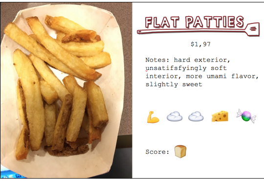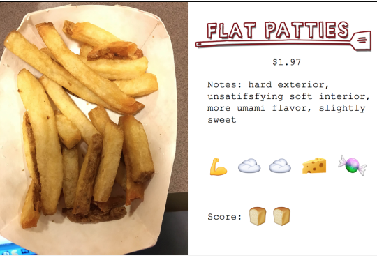 Parallel taste test of 6 French fries from different Cambridge restaurants, evaluating texture, flavor, and appearance using an emoji-based descriptive system.