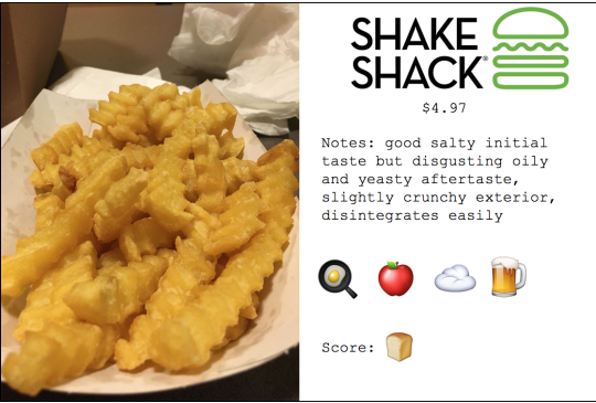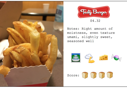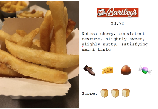 As mentioned in my team members’ posts, our team’s goal was to find the best bagel, bar and fry combo in Cambridge. We also wanted to play with this idea of using emojis to create a concise and descriptive visual language to describe flavors and textures with icons that are already well-known. I definitely lack Lydia’s flair for visual design, so please turn to her post for a good layout of the emojis that we chose to describe our foods.