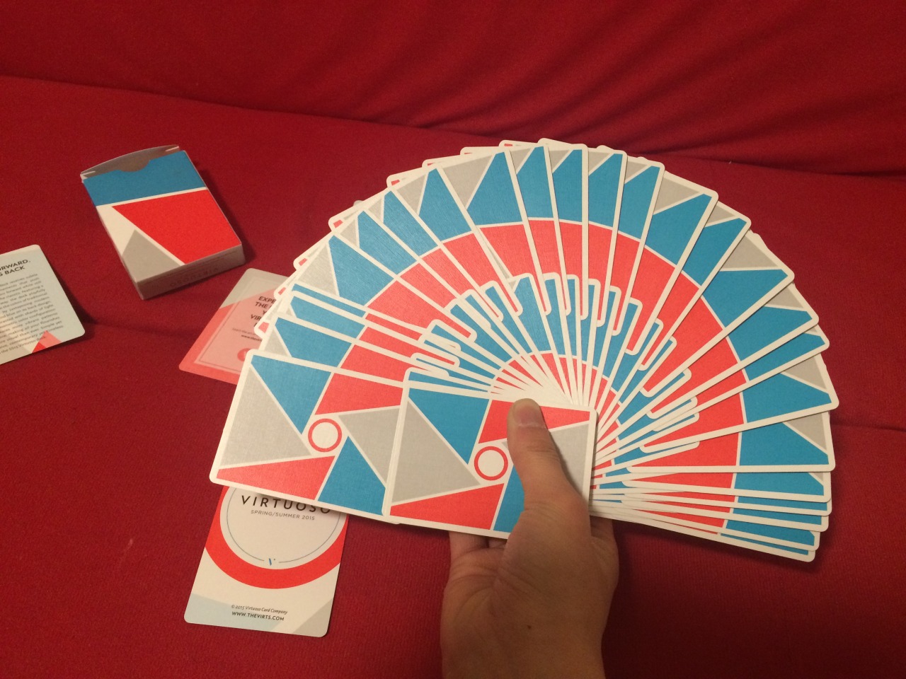 Virtuoso Spring/Summer 2015 limited-edition custom playing cards designed for cardistry, with specially chosen paper, finish, and geometric back design optimized for card flourishing.