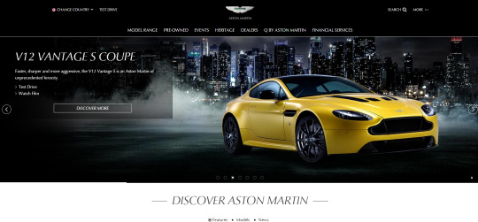 Aston Martin's official website, featuring immersive large-format layout showcasing luxury sports cars, heritage, and brand lifestyle.
