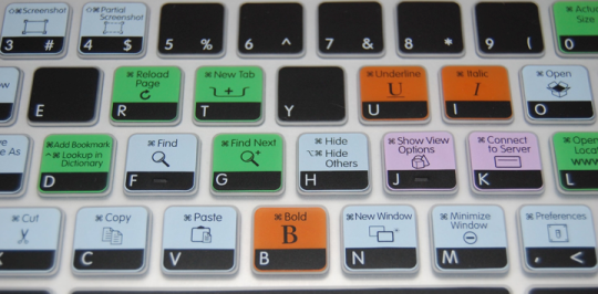 Color-coded silicone keyboard cover for MacBook that protects against liquid damage and provides keyboard shortcut references for Mac OS and Office programs.
