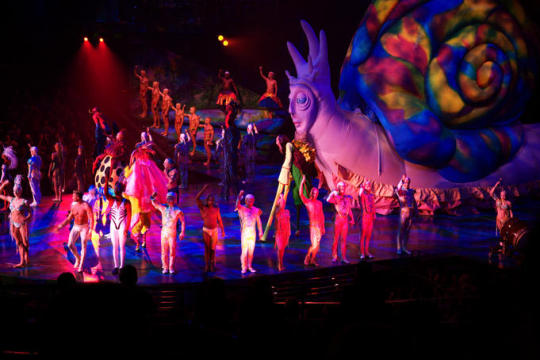 Cirque du Soleil's Mystere show at Treasure Island Las Vegas, featuring an elaborate theatrical set with vivid projected scenery and a curved amphitheater stage.