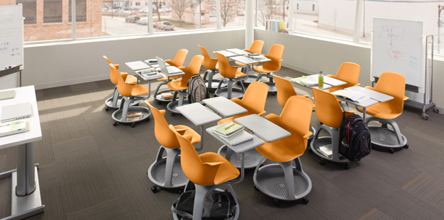 Node Chairs by IDEOThese are the Node Chairs designed by IDEO. They’re actually used in Quincy as well, in its Innovation Room. IDEO designed these chairs to be very flexible for how people want to use them. The three unique features to these chairs (other than just the shape of the seat itself being quite comfortable) are the desktop swivels wherever you want it, the chairs roll easily, and the bottom provides a lot of storage space for things you want to have on hand at all times. For example, if writing something, you can swivel the desk to its usual location in front of you or to the side if you are taking notes from a laptop on your lap. But if you don’t need the desk and are just talking to someone sitting in front of you, the desk can be swiveled out of the way for that interaction. The wheels on the chair allow the room to be rapidly rearranged for either individual work or group collaboration. We use them in the Innovation Room to break up for group work and then, when each group presents, we slide to wherever the group is presenting. This makes the working environment extremely flexible. Finally, when moving around or switch seats with normal chairs, you always have to pick up all your things and carry them with you. The pocket under the node chair keeps everything with you while you move.The threePhotos from: https://www.ideo.com/work/node-chair