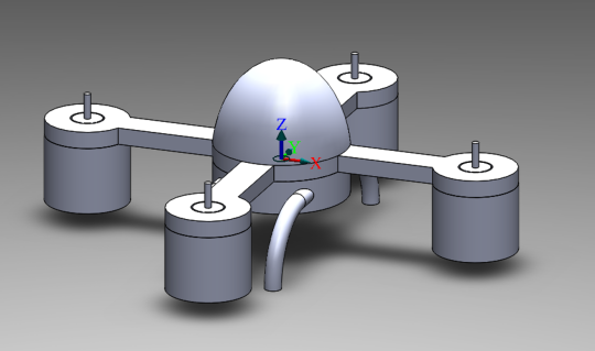 A student-designed drone rendered in 3D CAD software, shown as a gray quadcopter with a domed center body.