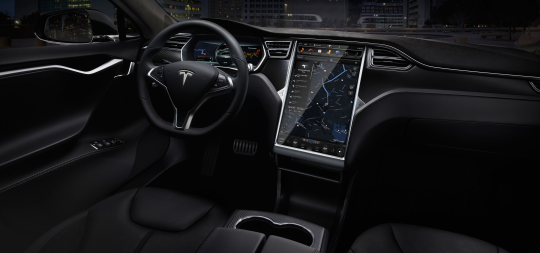 Tesla Model S, a sleek black electric luxury-sports sedan with ground-up design featuring front trunk, retractable door handles, and large touchscreen display.