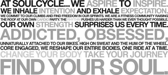 Both use simple colors (black, white, grey, and then one other color. In this case a vibrant and energetic yellow or orange). The rest of the studios also follow this simple vibe with encouraging quotes and clean, crisp lines. This type of aesthetic is also seen in the apparel that the stores sell since it is an easily transferable visual. They also both use words in their names that can be used in inspirational messages: “raise the bar” and “find your soul”.